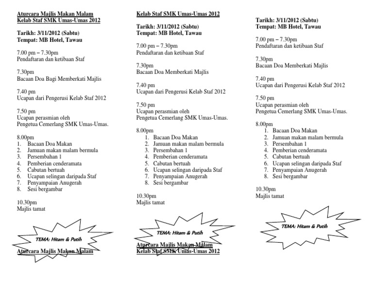 Web Laman sesawang mengumpulkan koleksi template buku program pecuma untuk anda template brosur buku program. Pastikan semua VIP syarikat dijemput untuk menghadiri majlis tersebut. Web ATURCARA MAJLIS MAKAN MALAM.